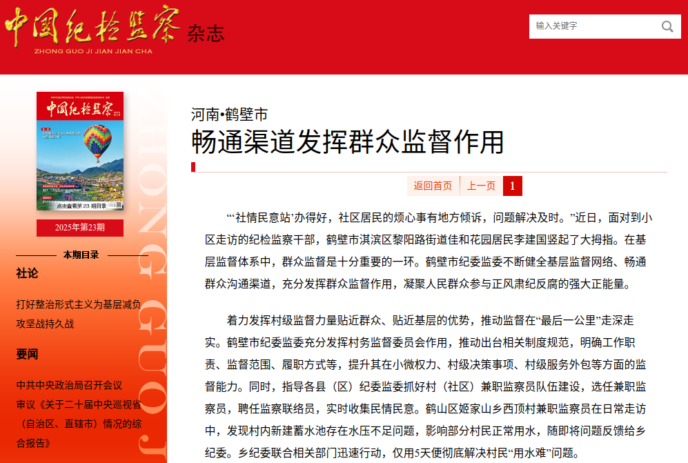 着力发挥村级监督力量贴近群众、贴近基层的优势,推动监督在“最后一公里”走深走实。鹤壁市纪委监委充分发挥村务监督委员会作用,推动出台相关制度规范,明确工作职责、监督范围、履职方式等,提升其在小微权力、村级决策事项、村级服务外包等方面的监督能力。同时,指导各县(区)纪委监委抓好村(社区)兼职监察员队伍建设,选任兼职监察员,聘任监察联络员,实时收集民情民意。鹤山区姬家山乡西顶村兼职监察员在日常走访中,发现村内新建蓄水池存在水压不足问题,影响部分村民正常用水,随即将问题反馈给乡纪委。乡纪委联合相关部门迅速行动,仅用5天便彻底解决村民“用水难”问题。