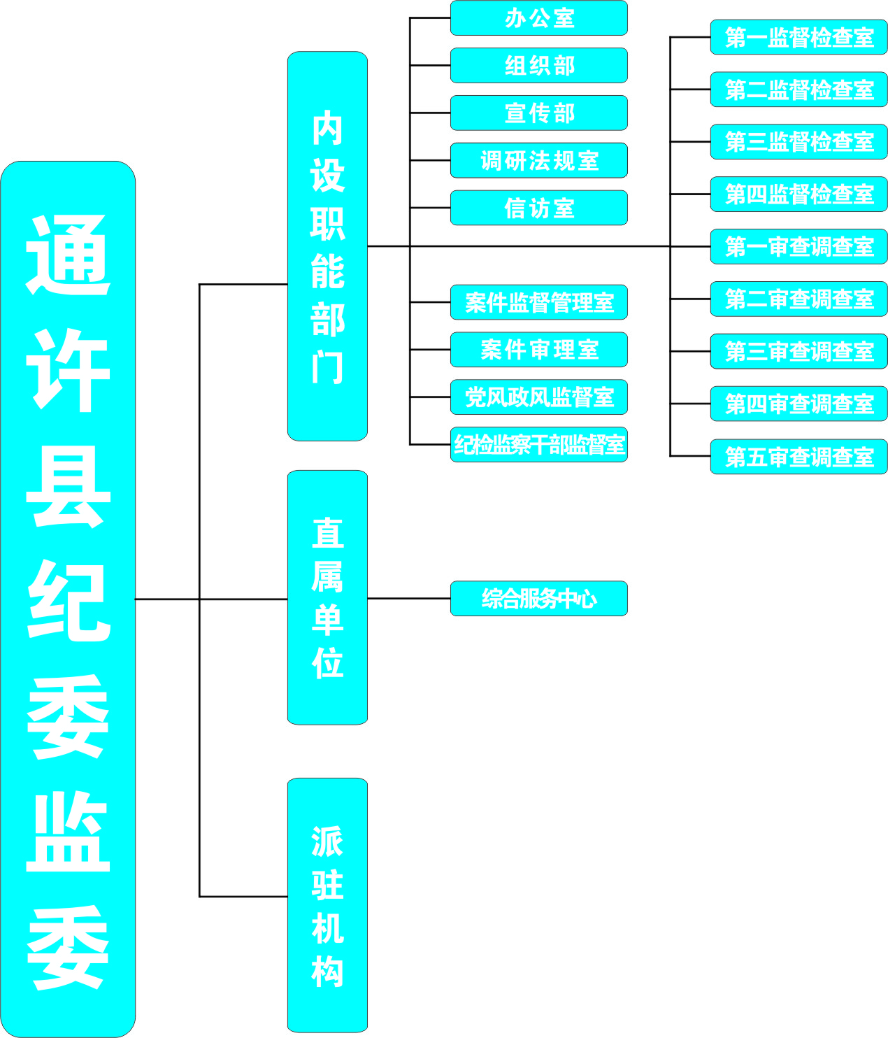 通许县纪委与通许县监委合署办公,组织机构包括:内设职能部门、直属单位和派驻纪检监察组。内设职能部门具体为:办公室、组织部、宣传部、调研法规室、信访室、案件监督管理室、案件审理室、党风政风监督室、第一监督检查室至第四监督检查室、第一审查调查室至第五审查调查室、纪检监察干部监督室。