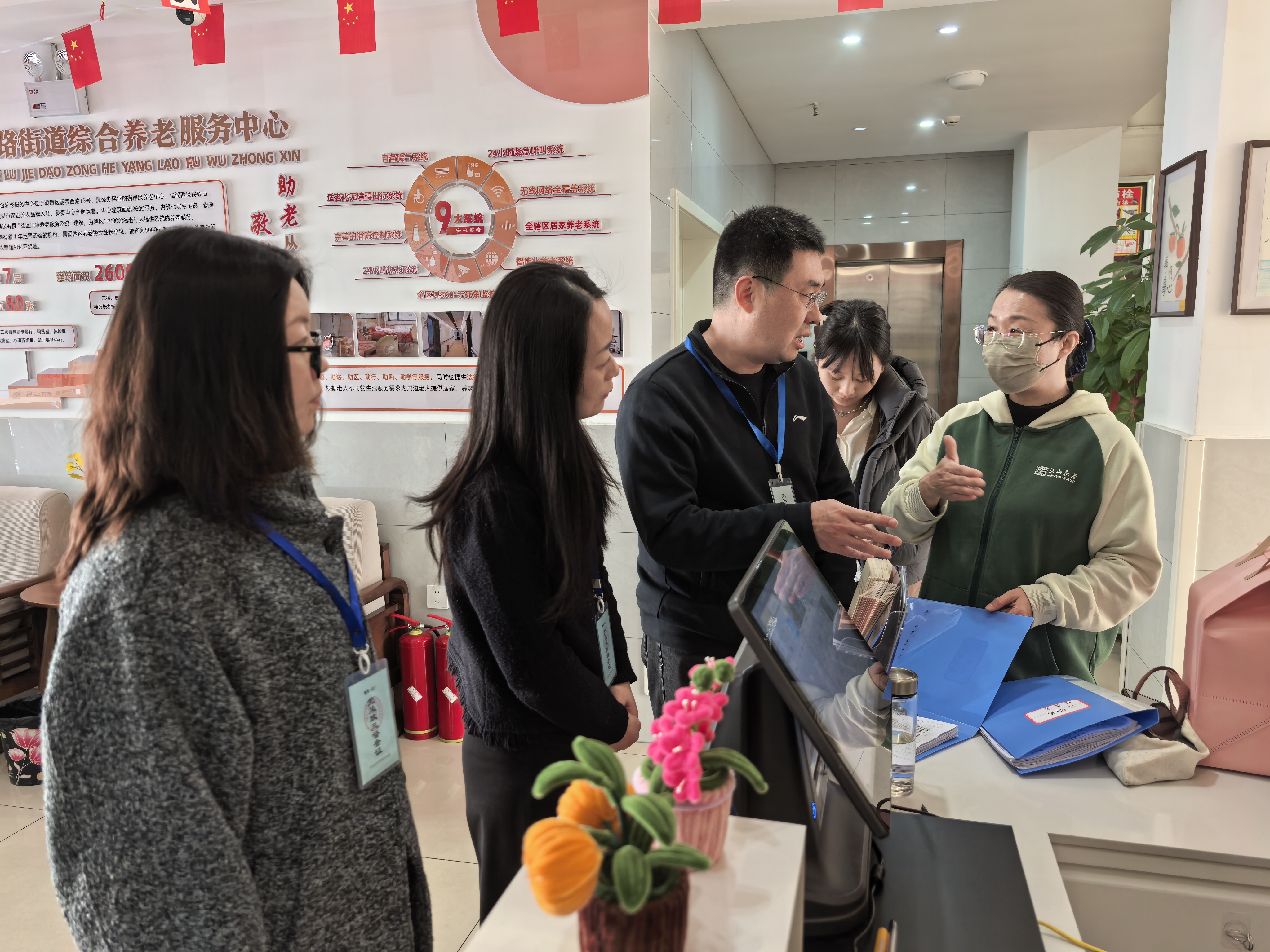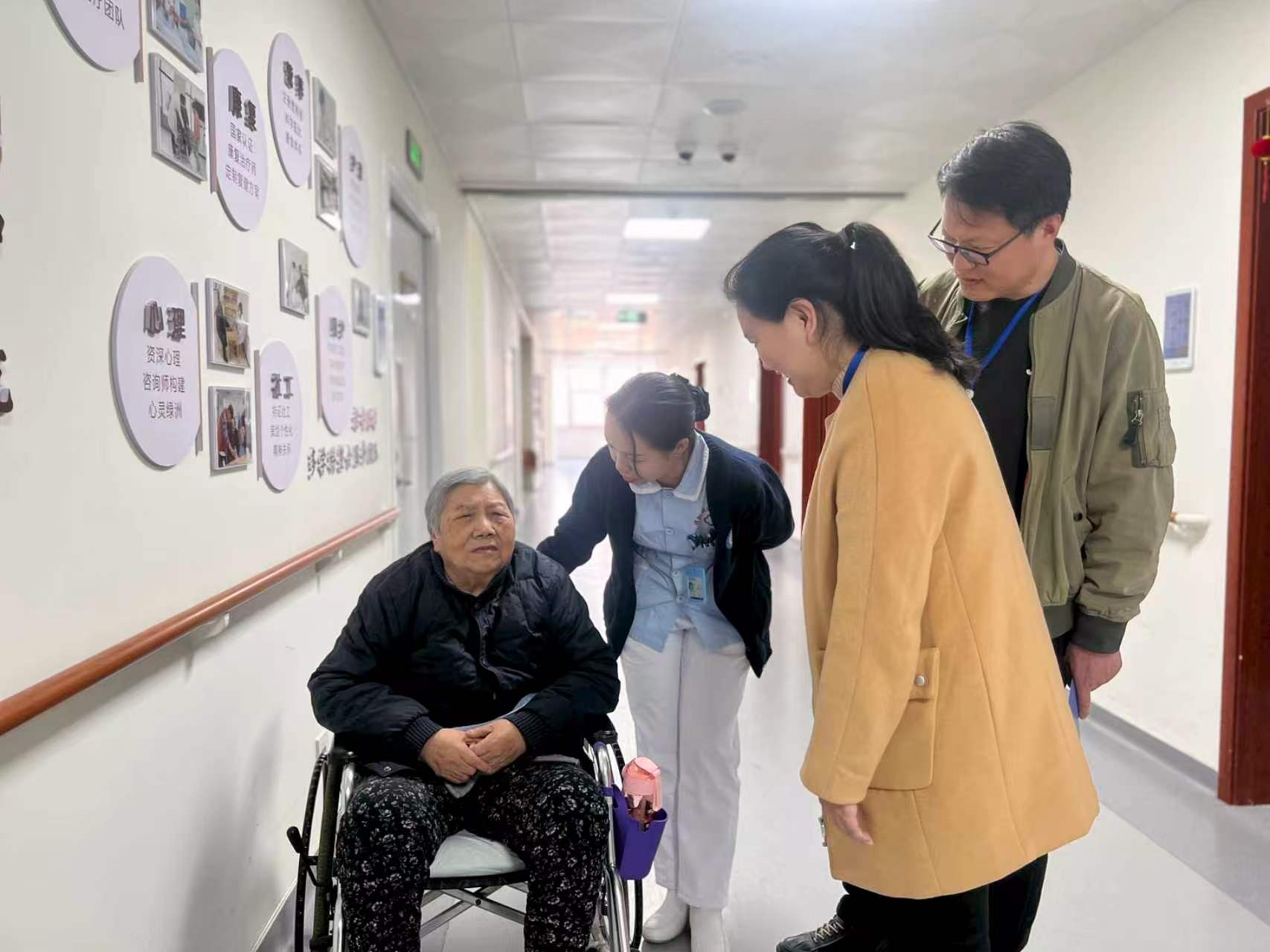 图为涧西区重庆路街道纪检监察干部在辖区医养中心走访了解医养融合养老服务模式运行情况。(蔡璐璐 摄)