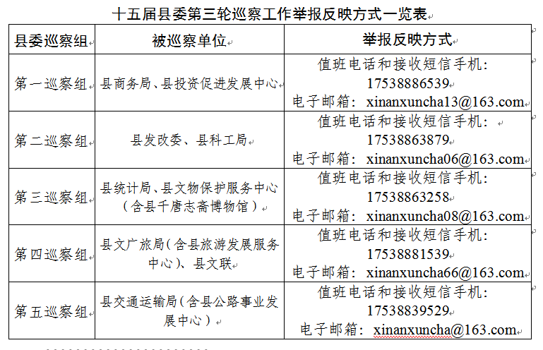 为加强巡察组与广大干部群众的联系,保证巡察工作健康有序开展,巡察期间各巡察组均开通专门值班电话、接收短信手机和电子邮箱,受理信访举报的时间为工作日的上午8:30至12:00,下午14:30至18:00。