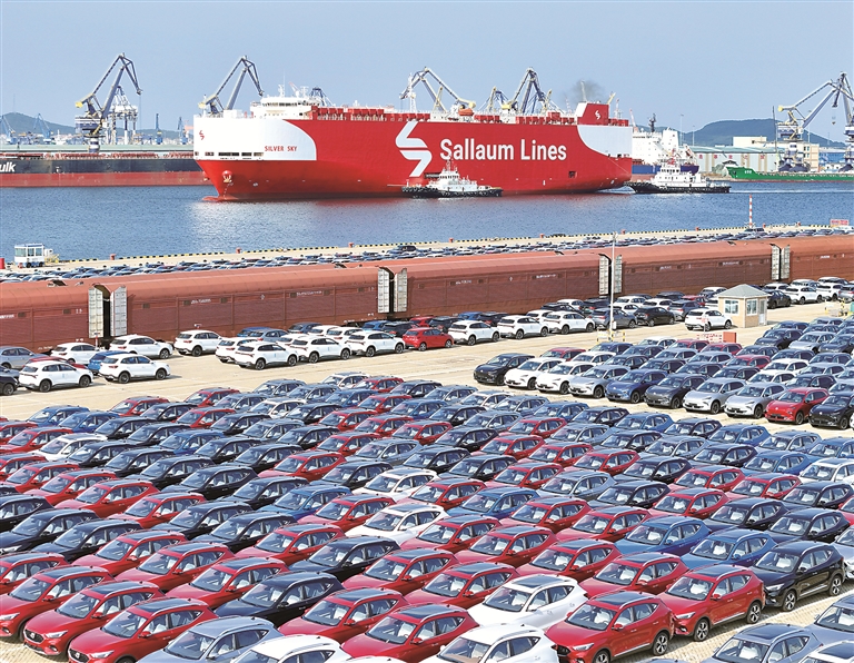 “十四五”时期,我国经济实力、科技实力、综合国力跃上新台阶,中国式现代化迈出新的坚实步伐,第二个百年奋斗目标新征程实现良好开局。图为近日,国产汽车在山东港口烟台港集结等待装船出口。新华社发(唐克 摄)