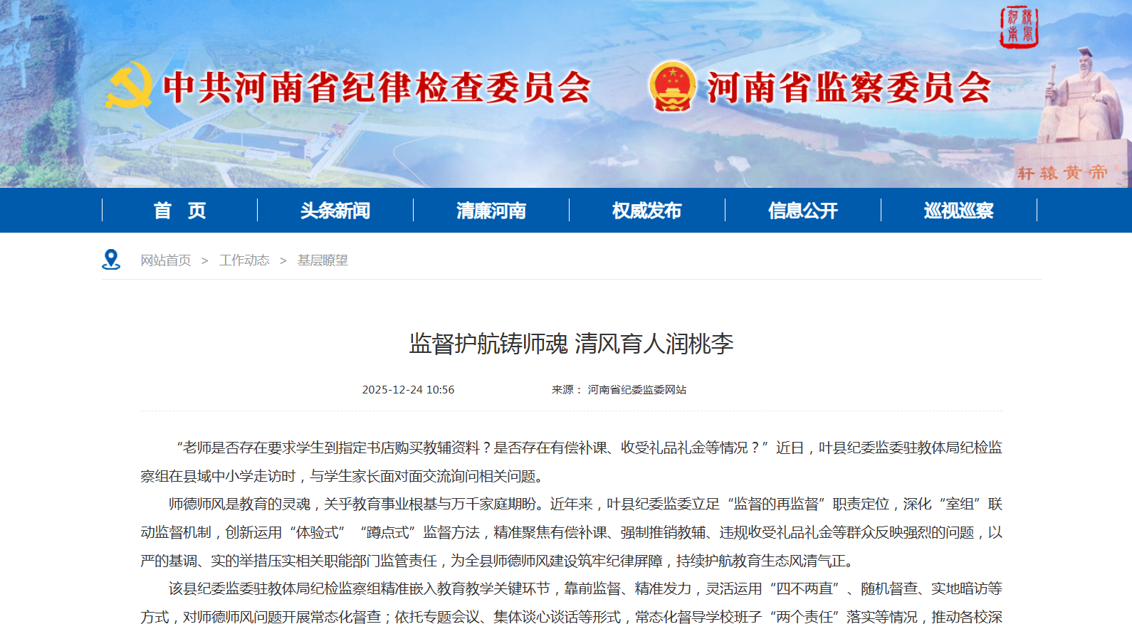 师德师风是教育的灵魂,关乎教育事业根基与万千家庭期盼。近年来,叶县纪委监委立足“监督的再监督”职责定位,深化“室组”联动监督机制,创新运用“体验式”“蹲点式”监督方法,精准聚焦有偿补课、强制推销教辅、违规收受礼品礼金等群众反映强烈的问题,以严的基调、实的举措压实相关职能部门监管责任,为全县师德师风建设筑牢纪律屏障,持续护航教育生态风清气正。