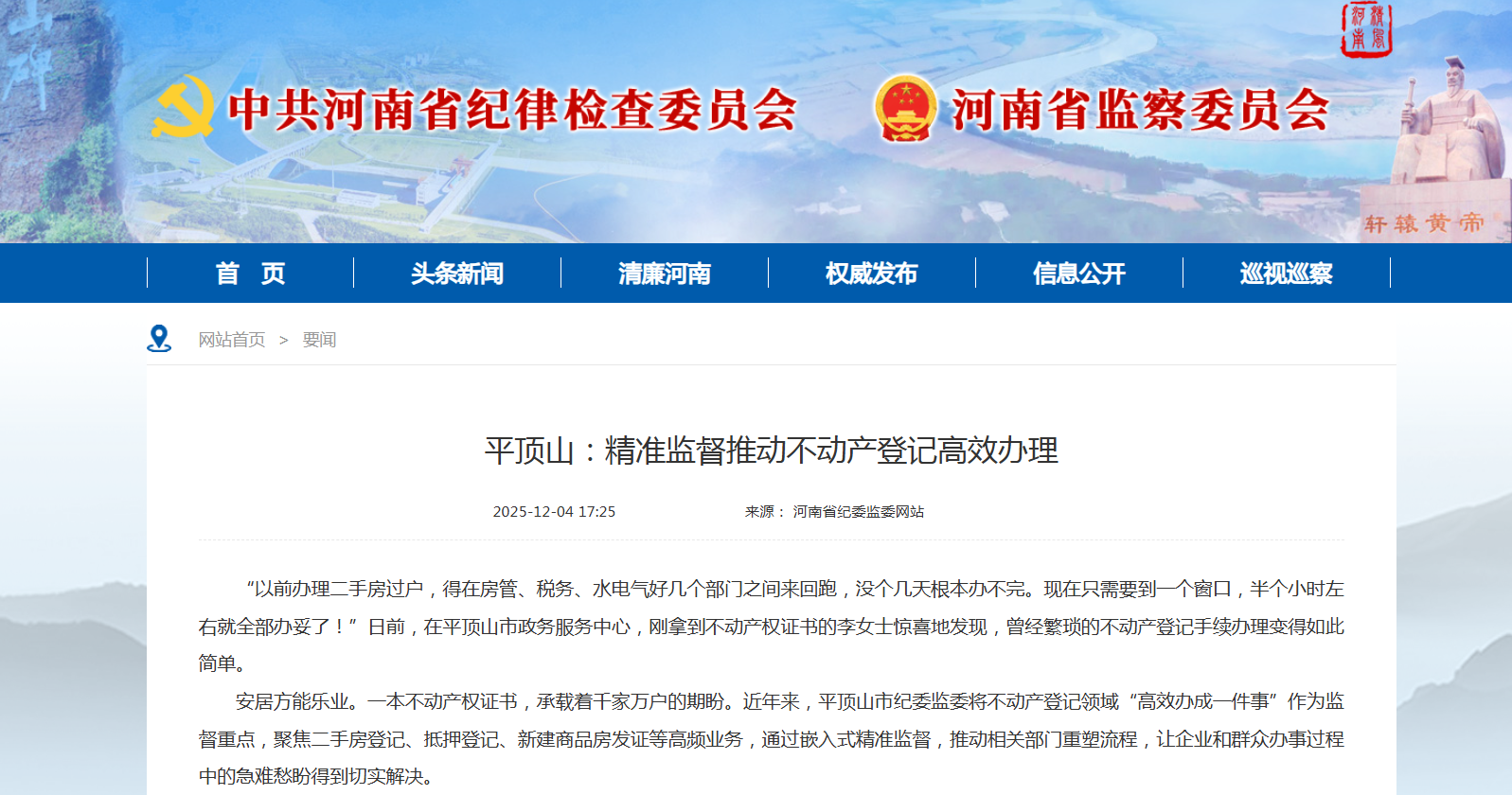 安居方能乐业。一本不动产权证书,承载着千家万户的期盼。近年来,平顶山市纪委监委将不动产登记领域“高效办成一件事”作为监督重点,聚焦二手房登记、抵押登记、新建商品房发证等高频业务,通过嵌入式精准监督,推动相关部门重塑流程,让企业和群众办事过程中的急难愁盼得到切实解决。