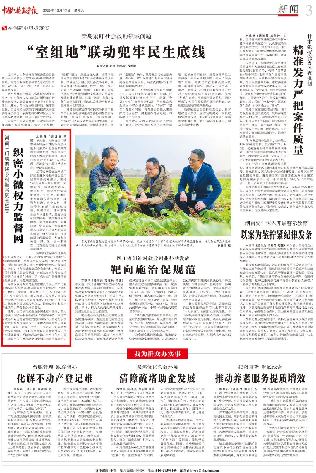 聚焦财政衔接推进乡村振兴补助资金,三门峡市纪委监委制定工作指引,明确负面清单,厘清项目申报实施、资金拨付使用、项目绩效评价、资产后续管理等各环节风险点。同时,该市纪委监委联合农业农村、财政、审计等职能部门组建督导组,对近三年来衔接资金项目开展“全链条”排查,以“点对点”督导推动责任压紧压实、问题真改实改。