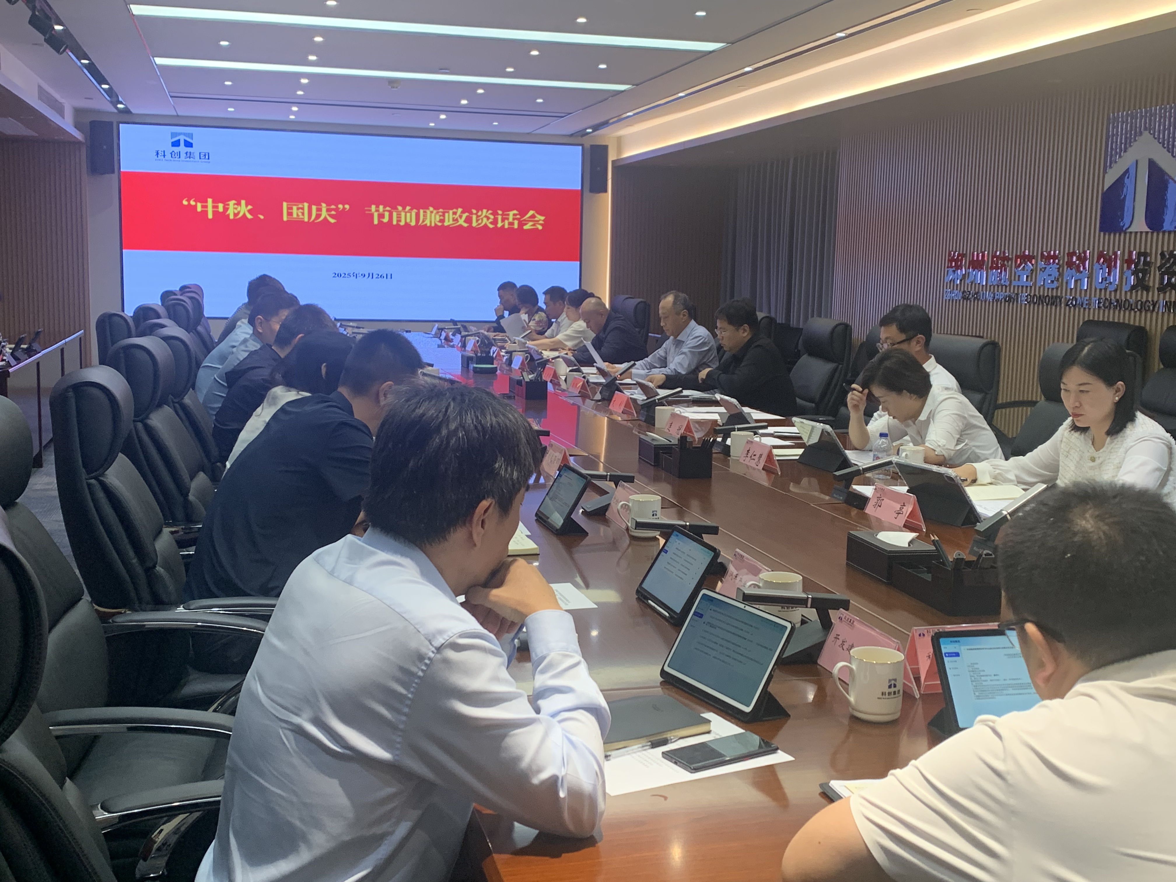 科创集团纪委召开节前集体廉政谈话会议,号召广大党员干部严格执行中央八项规定及其实施细则精神,自觉遵守廉洁自律各项规定,不触红线、不越底线,做到廉洁过节。