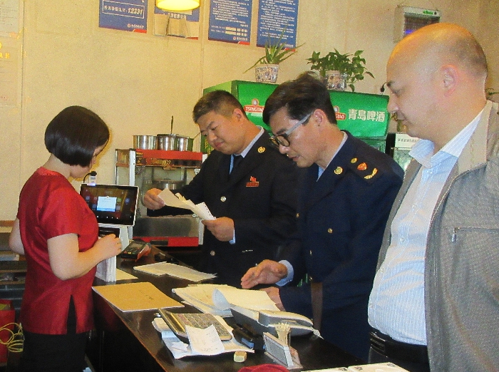 淇滨区纪委监察委联合工商、税务等部门在某饭店前台严查违规公款吃喝等问题。