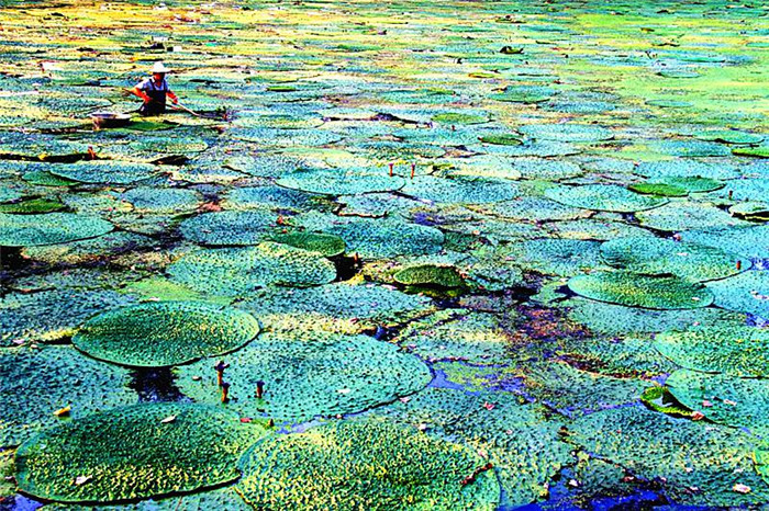 仲秋时节,豫南池塘里的鸡头米相继成熟散发出阵阵清香,水中的大“玉盘”与天空皎洁的圆月遥相辉映,预示着丰收和团圆。