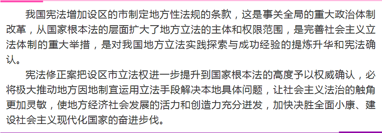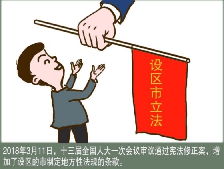 2018年3月11日,十三届全国人大一次会议审议通过《中华人民共和国宪法修正案》,宪法第一百条增加一款,作为第二款:“设区的市的人民代表大会和它们的常务委员会,在不同宪法、法律、行政法规和本省、自治区的地方性法规相抵触的前提下,可以依照法律规定制定地方性法规,报本省、自治区人民代表大会常务委员会批准后施行。”为什么要增加设区的市制定地方性法规的条款?有何重大意义?小栋今天带你一起好好学习。