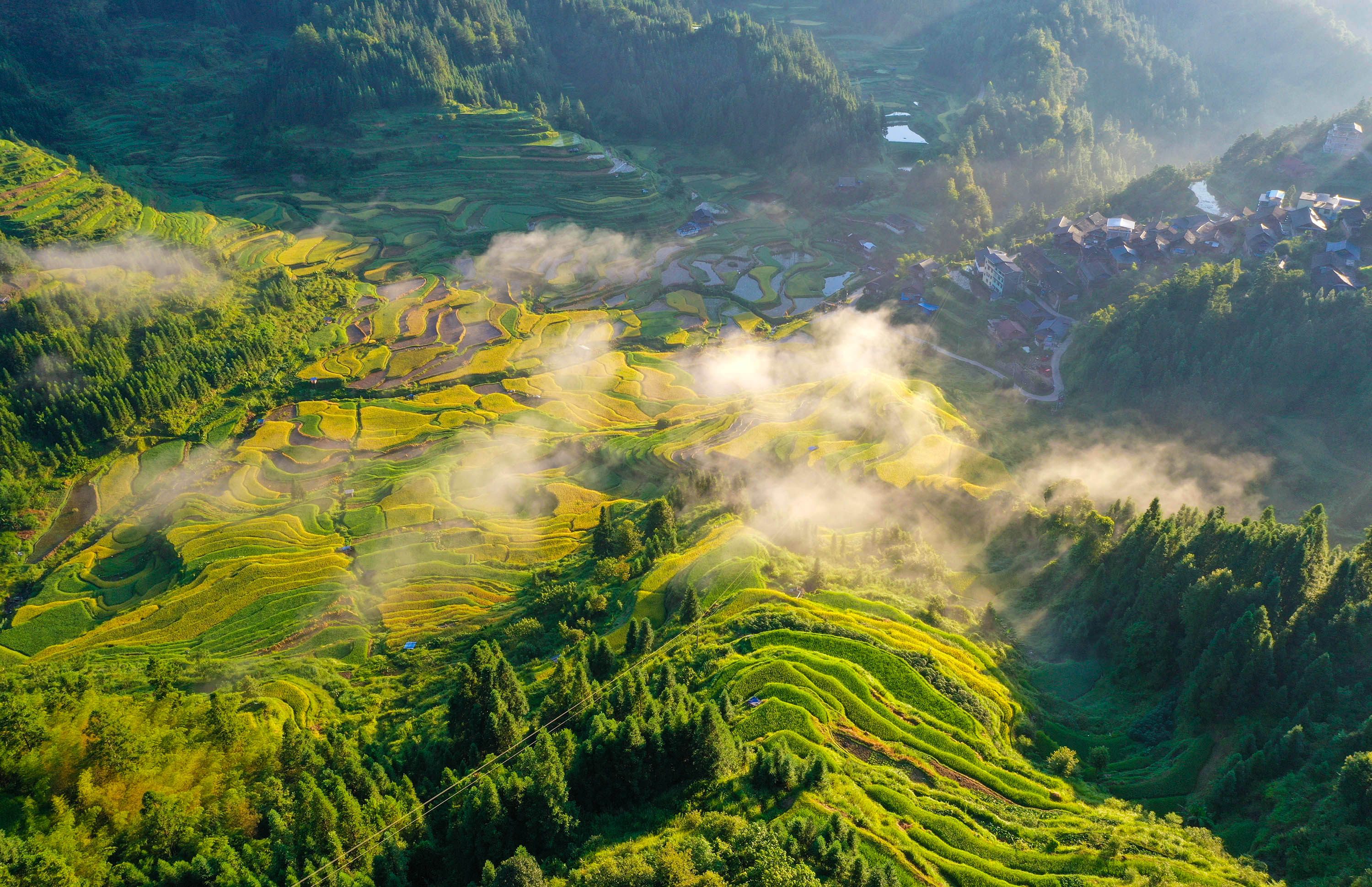 广西壮族自治区融水苗族自治县高寒山区层层叠叠的梯田色彩斑斓、云蒸雾绕,与金黄的稻谷、古朴的民居、翠绿的大山相映成景,美如画卷。图为该县杆洞乡百秀村孔门苗寨,景色宜人,美不胜收。(广西融水苗族自治县纪委监委供 龙林智 摄)