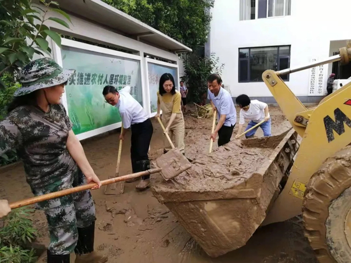 山阳区纪委监委全体纪检监察干部,轮流上阵清理淤泥,坚持不懈帮助光亚新村受灾群众重建家园。(张杰 摄)