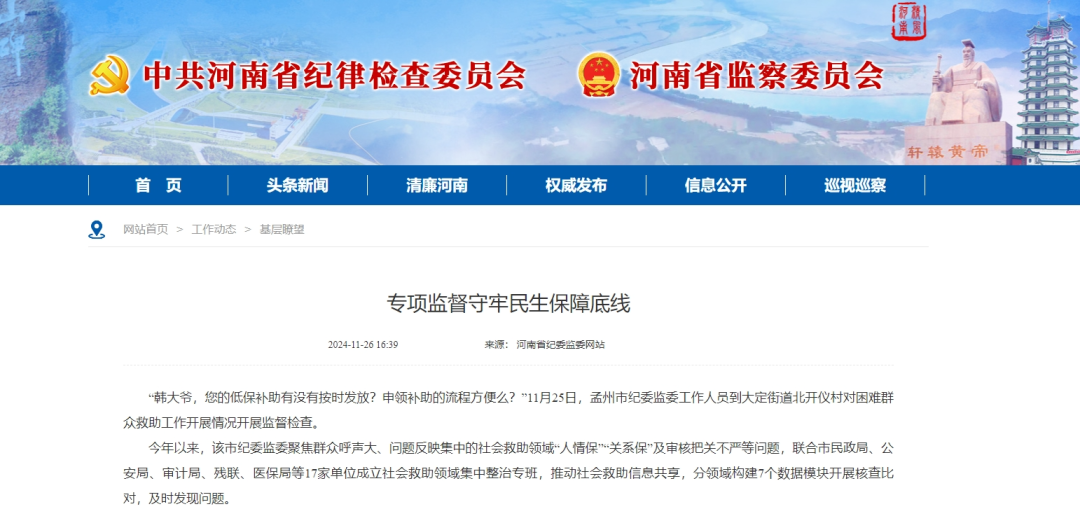 同时,该市纪委监委还充分发挥乡镇(街道)纪(工)委和村务监督委员会作用,全过程监督低保申请、审核、公示、发放等环节,严肃查处优亲厚友、审核不严等行为,切实以有力监督守牢民生保障底线。