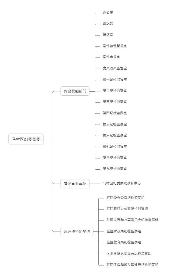马村区纪委机关与马村区监委合署办公,共有15个内设机构,分别为:办公室、组织部、信访室、案件监督管理室、案件审理室、党风政风监督室、第一至八纪检监察室、第九纪检监察室。实行统一管理的派驻机构7个。