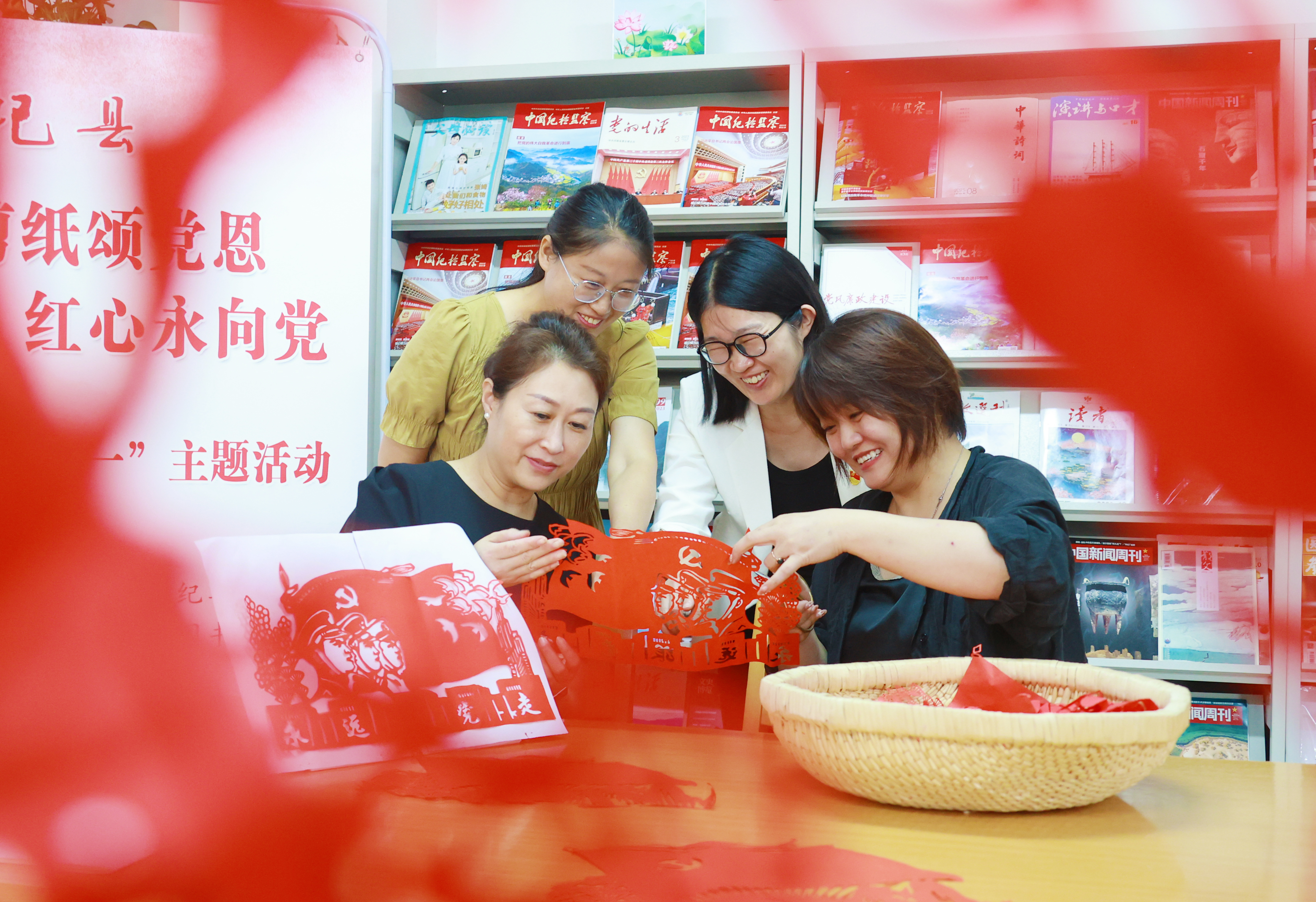 “七一”来临之际,为弘扬伟大建党精神,传承和发扬党的光荣传统和优良作风,杞县纪委监委组织开展“剪纸颂党恩 红心永向党 ”主题活动,引导党员干部在方寸裁剪中感受非遗文化魅力,筑牢信仰根基。图为纪检监察干部向非遗传承人学习剪纸。(杨金慧 摄)