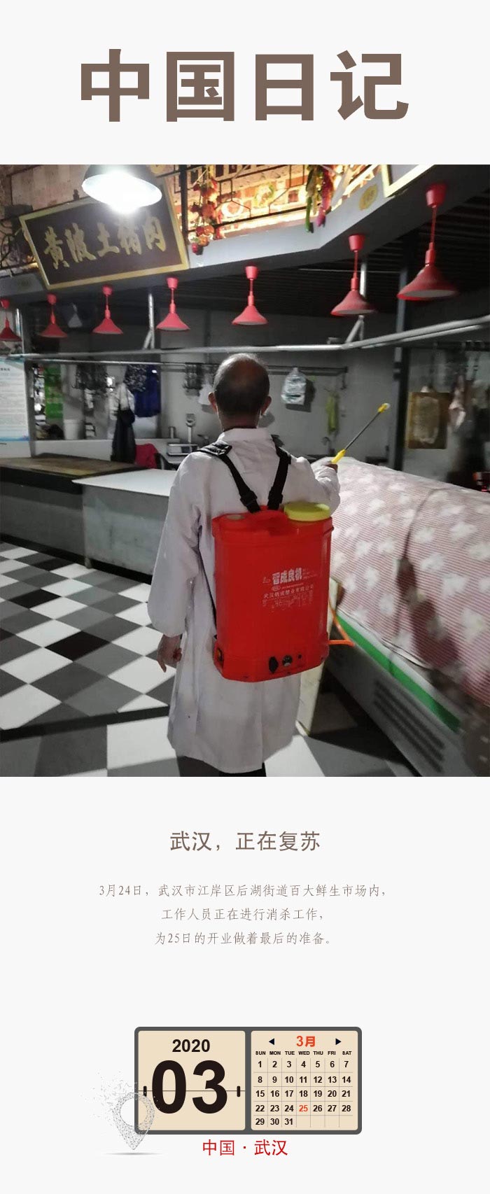 3月24日,武汉市江岸区后湖街道百大鲜生市场内,工作人员正在进行消杀工作,为第二天的开业做着最后的准备。从25日起,这个关闭了2个月的市场将正式恢复营业,时间为早8:30至下午16:00。