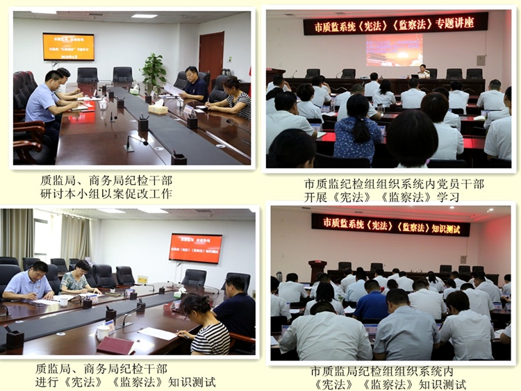 一是组织专题学习。驻质监局纪检组组织了质监系统专兼职纪检干部学习以案促改工作会议精神及宪法、监察法等法律法规;同商务局纪检组一起学习省、市纪委以案促改工作领导讲话,研讨制定本小组活动方案,集中学习宪法、监察法并进行专场测试。组织质监系统全体干部集中开展宪法、监察法讲授、集中测试活动。