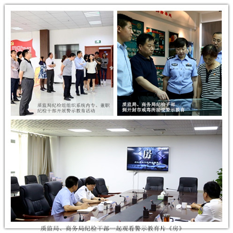三是接受警示教育。组织质监系统中层以上干部以系统内部经典案例为反面教材进行警示教育;同商务局纪检组一起观看警示教育片《房》,警醒每一个岗位的廉政风险;同商务局纪检组一起到开封市戒毒所进行警示教育活动。