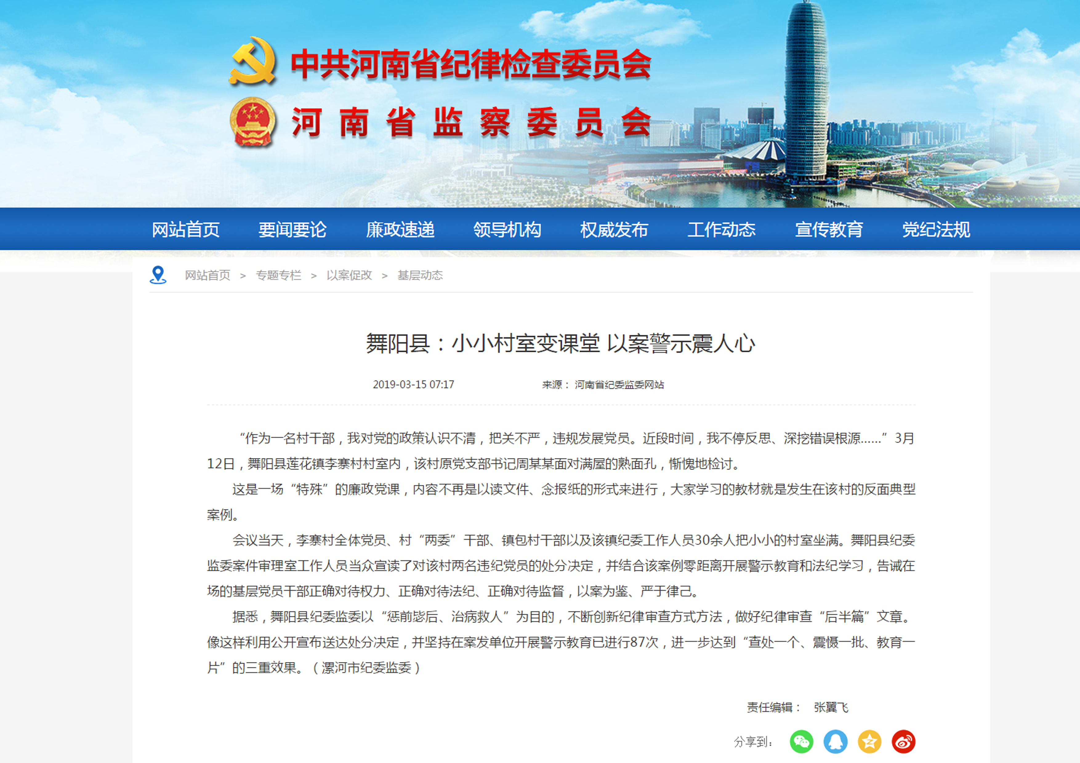 会议当天,李寨村全体党员、村“两委”干部、镇包村干部以及该镇纪委工作人员30余人把小小的村室坐满。舞阳县纪委监委案件审理室工作人员当众宣读了对该村两名违纪党员的处分决定,并结合该案例零距离开展警示教育和法纪学习,告诫在场的基层党员干部正确对待权力、正确对待法纪、正确对待监督,以案为鉴、严于律己。