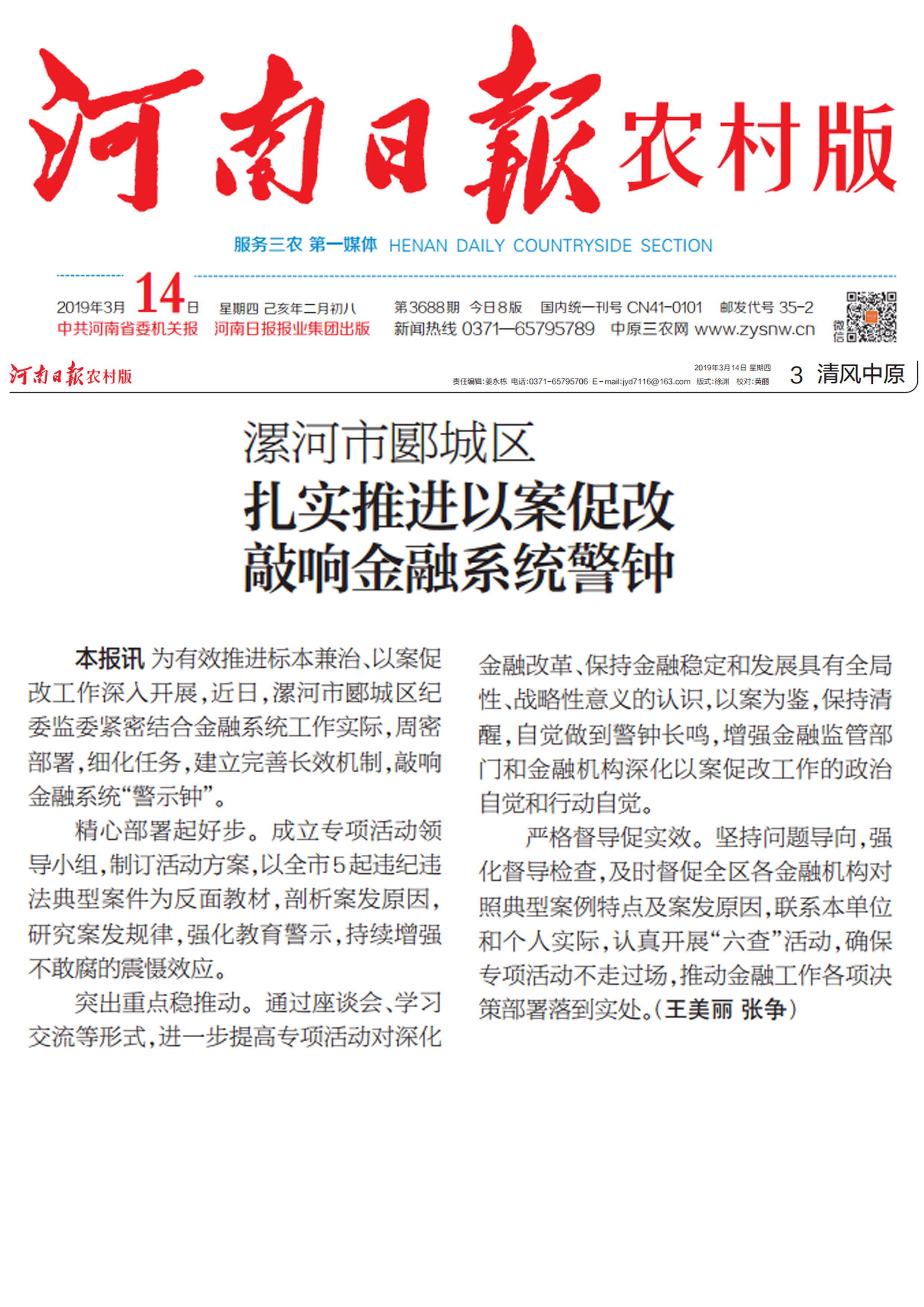 本报讯为有效推进标本兼治、以案促改工作深入开展,近日,漯河市郾城区纪委监委紧密结合金融系统工作实际,周密部署,细化任务,建立完善长效机制,敲响金融系统“警示钟”。