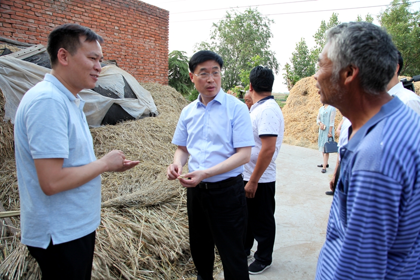 图为:赵会生在高沟村详细询问贫困户俞河小麦收成情况