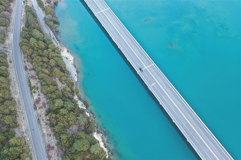 图为西藏“最美水上公路”拉林高等级公路多布特大桥路段航拍图。 图片来源:视觉中国