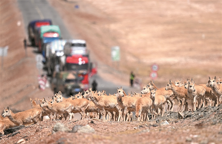 图为一群待产雌性藏羚羊正在通过青藏公路,前往可可西里卓乃湖产仔。新华社记者 张宏祥 摄