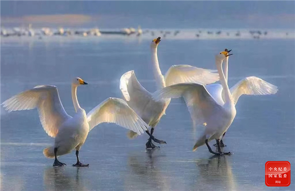 在河南省三门峡的天鹅湖,天鹅在冰面上展翅舞步,引颈高歌,一曲“冰上芭蕾”演绎着冬日之歌。(河南省三门峡市湖滨区纪委监委供 何圣斌 摄)
