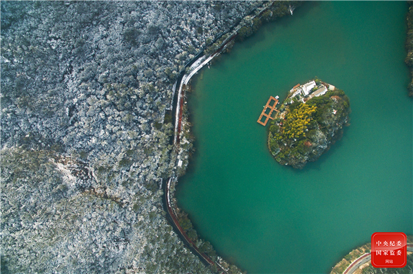 轻盈的雪花缓缓落下,为静谥的山林披上素雅的头纱,一半翠湖一半“白纱”林,风光独好。(浙江省桐庐县纪委监委供 邹鸿 摄)