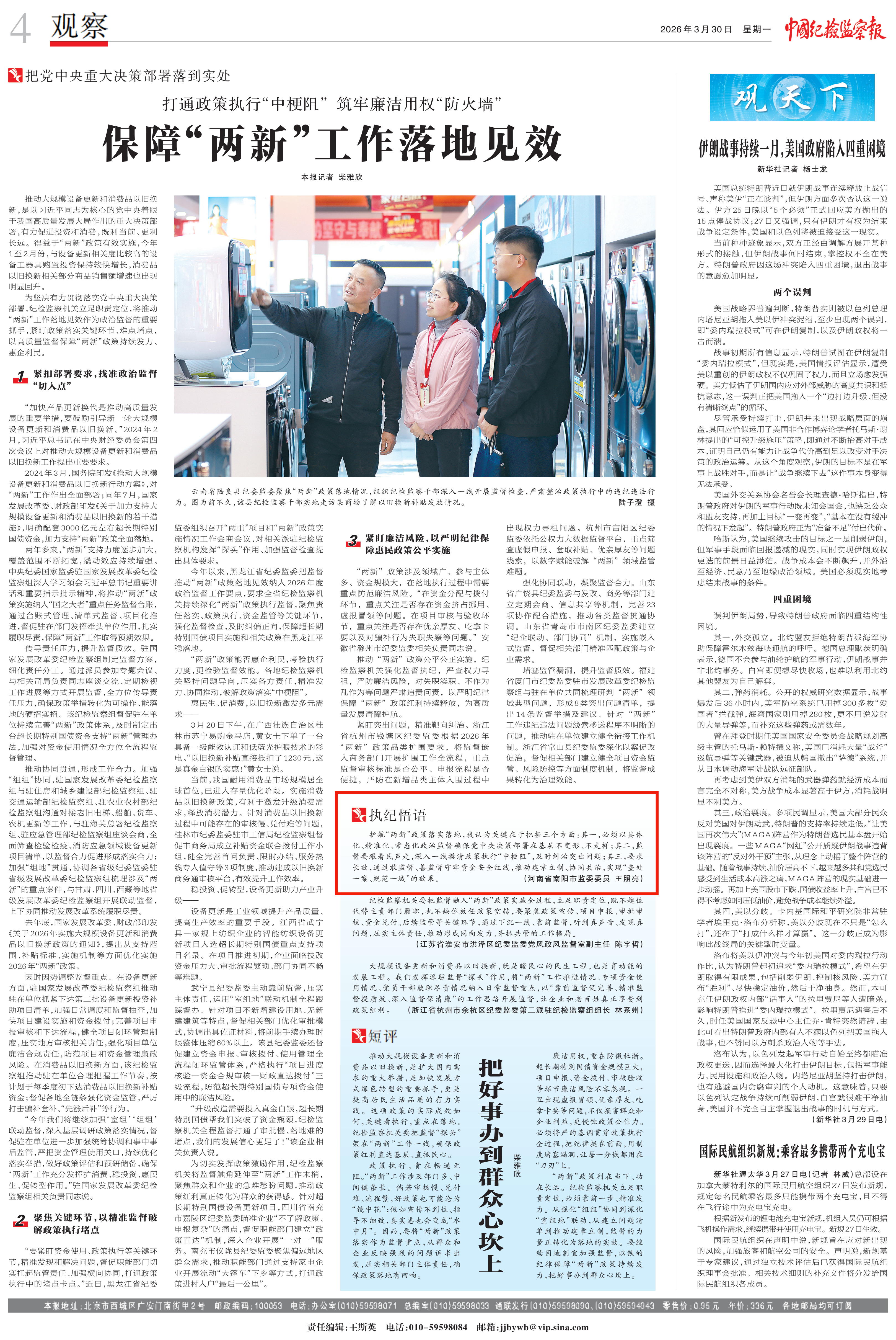 护航“两新”政策落实落地,我认为关键在于把握三个方面:其一,必须以具体化、精准化、常态化政治监督确保党中央决策部署在基层不变形、不走样;其二,监督要跟着民声走,深入一线摸清政策执行“中梗阻”,及时纠治突出问题;其三,要求长效,通过敢监督、善监督守牢资金安全红线,推动建章立制、协同共治,实现“查处一案、规范一域”的效果。(河南省南阳市监委委员 王照亮)