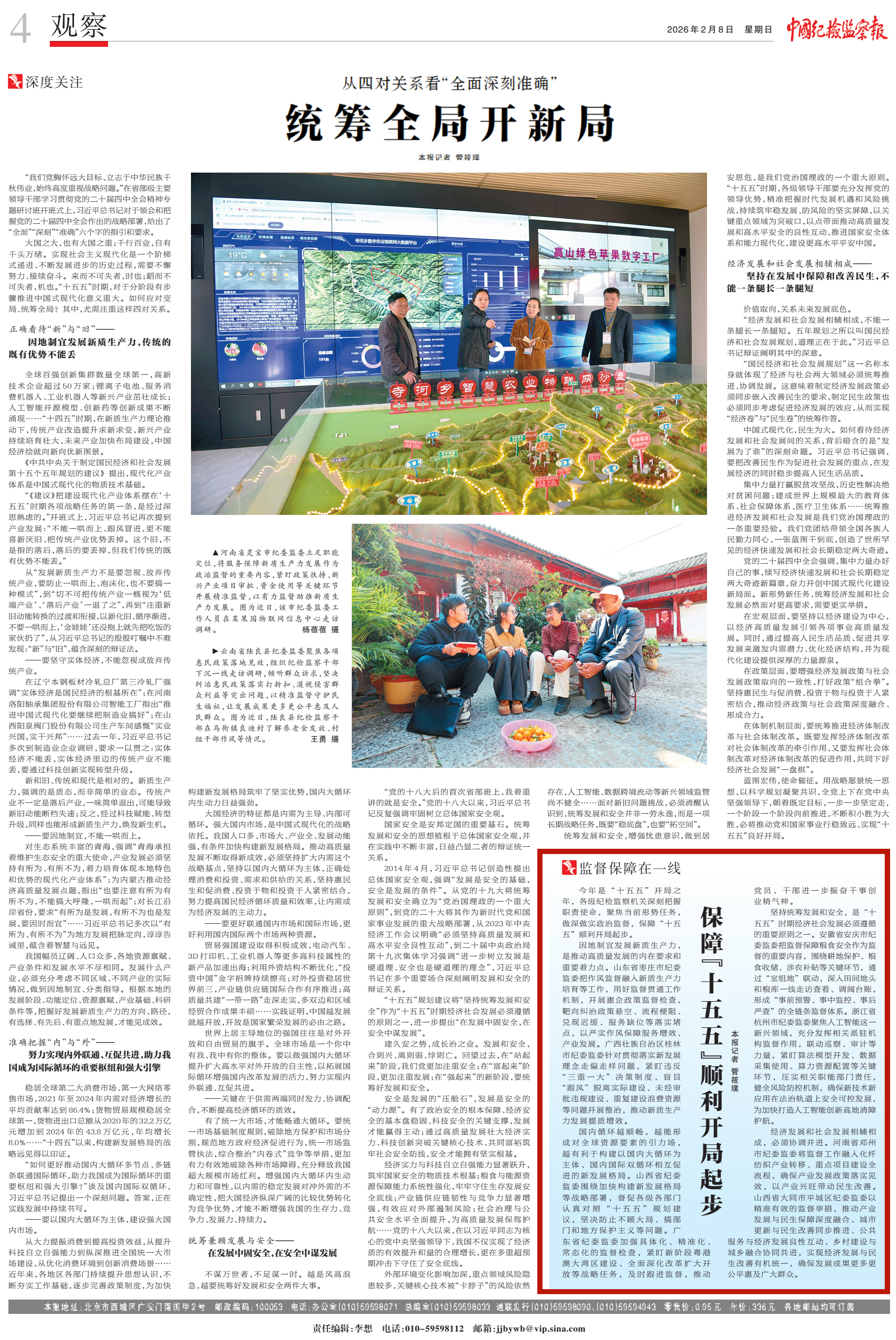 坚持统筹发展和安全,是“十五五”时期经济社会发展必须遵循的重要原则之一。安徽省安庆市纪委监委把监督保障粮食安全作为监督的重要内容,围绕耕地保护、粮食收储、涉农补贴等关键环节,通过“室组地”联动,深入田间地头和粮库一线走访查看、调阅台账,形成“事前预警、事中监控、事后严查”的全链条监督体系。浙江省杭州市纪委监委聚焦人工智能这一新兴领域,充分发挥相关派驻机构监督作用,联动巡察、审计等力量,紧盯算法模型开发、数据采集使用、算力资源配置等关键环节,压实相关职能部门责任,健全风险防控机制,确保新技术新应用在法治轨道上安全可控发展,为加快打造人工智能创新高地清障护航。