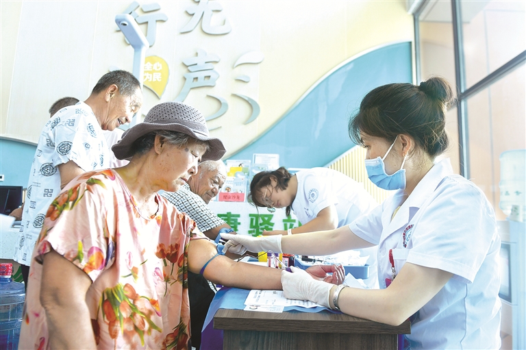 图为8月18日,在山东省青岛市城阳区夏庄街道社区卫生服务中心,医生为社区居民义诊。 新华社发(王海滨 摄)