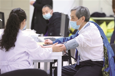 北京市已经为部分有接种需求且身体基础状况较好的60岁及以上老年人接种新冠疫苗。图为北京市海淀区学院路疫苗接种点内,60岁的郭先生在接种疫苗前测量血压。中新社记者 蒋启明 摄
