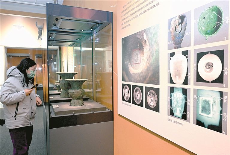 “妙手活千秋——科技考古与遗产保护经典成就展”近日在北京中国考古博物馆开幕。图为参观者在展厅了解青铜器的研究保护情况。新华社记者 李贺 摄