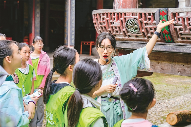 日前,在浙江省宁海县深甽镇清潭村的现场思政课上,老师和学生共同探讨交流保护和发展古村落。宁海县深甽镇人民政府供图