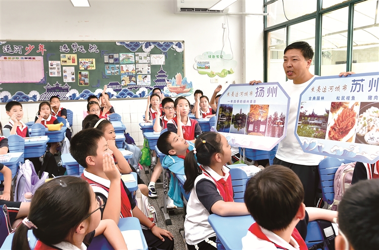 江苏省扬州市育才小学思政课堂上,老师通过自制的教学展板向同学们讲述大运河沿线重要节点城市各具特色的运河文化。图片来源:视觉中国