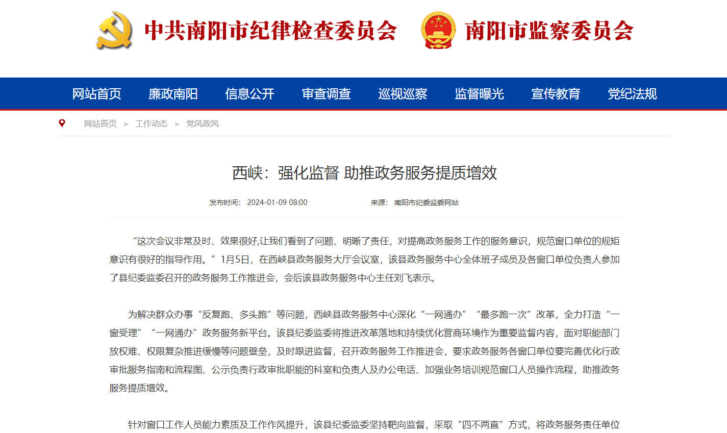 “这次会议非常及时、效果很好,让我们看到了问题、明晰了责任,对提高政务服务工作的服务意识,规范窗口单位的规矩意识有很好的指导作用。”1月5日,在西峡县政务服务大厅会议室,该县政务服务中心全体班子成员及各窗口单位负责人参加了县纪委监委召开的政务服务工作推进会,会后该县政务服务中心主任刘飞表示。