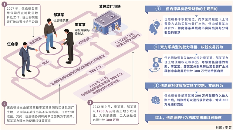 2007年,伍启德在负责甲公司所在地块征地拆迁工作过程中,李某某提出需为甲公司另行选址生产经营,伍启德则提出将某包装厂地块置换给李某某,但由其亲戚邹某某(另案处理)和李某某共同购买该包装厂土地,李某某本不愿与邹某某合作购买该土地,基于伍启德的职权地位表示同意。伍启德又向邹某某提出其不实际出资,日后分得收益,邹某某表示同意。2008年,在对甲公司所在地块征地拆迁时,伍启德接受李某某请托,利用职务便利,违规帮助甲公司增加征地拆迁补偿款60.43万元。在某包装厂地块置换过程中,伍启德协调有关单位加快为李某某、邹某某办理土地使用权证等事宜。2012年9月,李某某、邹某某以1200万元将该土地予以转让。经查,该地块购买价为240.6万元,李某某出资145.3万元,占比60.39%,邹某某出资95.3万元,占比39.61%。按实际出资比例,1200万元土地转让款中,李某某应得724.68万元,邹某某应得475.32万元。2013年,在伍启德的要求下,李某某、邹某某为感谢伍启德提供的帮助,在收到土地转让款后分别将124.68万元、175.32万元共计300万元送给伍启德,伍启德要求暂存于邹某某处,同年10月,伍启德安排邹某某将该300万元取现存入以他人名义开设的账户,转账借给伍启德好友杨某某(非管理和服务对象)处放贷收息。因经营亏损,杨某某未按约定还本付息。
