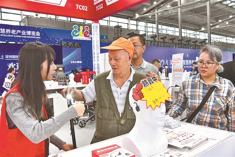 2024深圳国际智慧养老产业博览会近日在深圳会展中心(福田)举行。博览会集中展示超过1000种智慧养老产品和技术,涵盖智慧产品、适老化改造、智能辅具、老龄科技、养老金融及康养教育等多元化领域。图为老人在博览会上了解一款智能手杖。新华社发