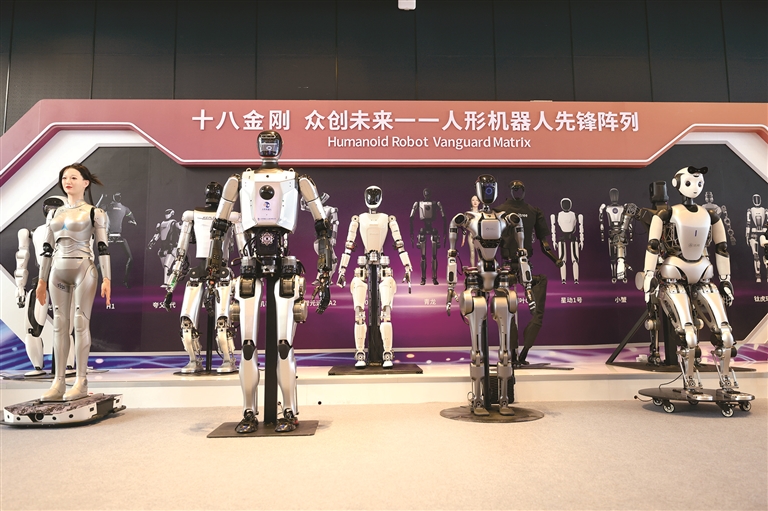图为2024世界人工智能大会暨人工智能全球治理高级别会议(WAIC 2024),国家地方共建人形机器人创新中心十八金刚人形机器人先锋阵列。