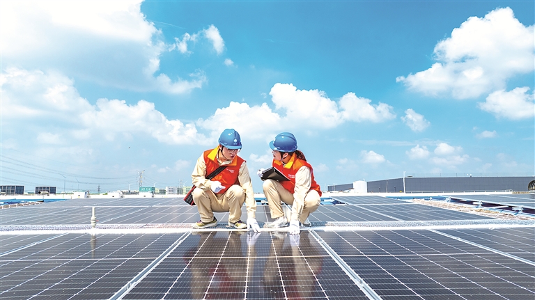 近年来,江苏省兴化市全域推进工业园区屋顶分布式光伏发电项目建设,引导企业使用清洁能源、加快绿色转型升级。图为工作人员在当地一家企业屋顶检查光伏发电装置运行状况。 图片来源:视觉中国