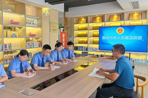 江苏省泗阳县纪委监委坚持抓早抓小,切实用好第一种形态,做实做细日常监督,及时纠正苗头性、倾向性问题。图为该县纪委监委派驻第十三纪检监察组干部对县人民检察院新进检察人员开展廉洁提醒谈话。 熊巍 摄