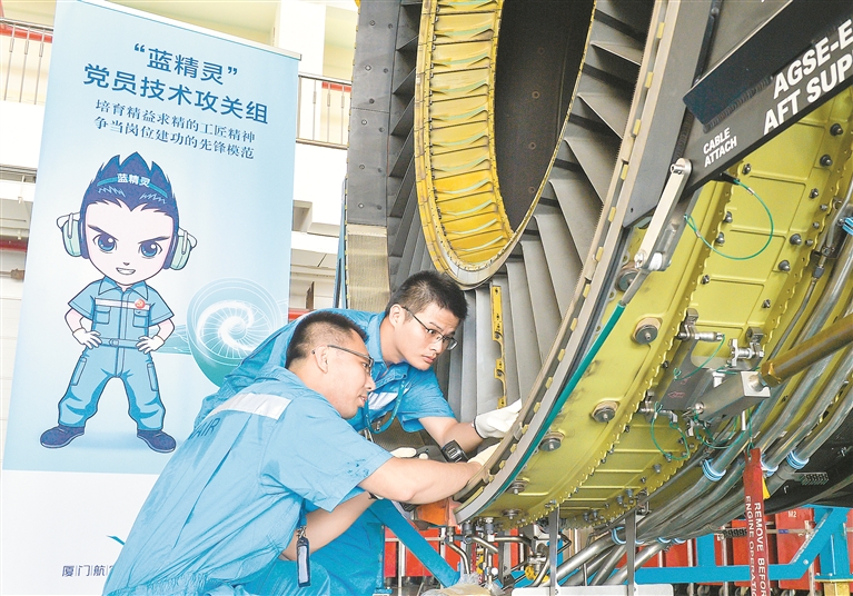 厦门航空纪检监察机构加强空勤、机务维修队伍作风建设监督,推动“三老四严”精神落实到每一个航班、每一个环节,保障人民生命财产安全。图为厦航飞机维修工程部“蓝精灵”党员技术攻关组开展发动机孔探检查,识别处置安全风险。 李朋 摄