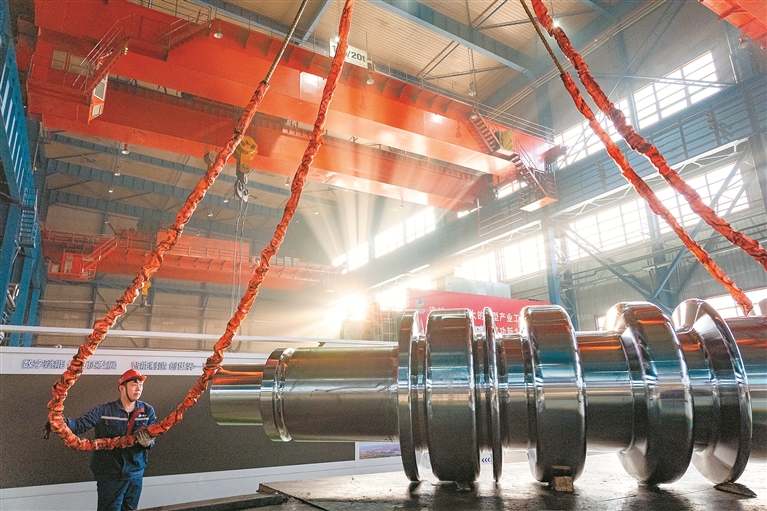 近年来,中国一重集团坚持创新引领,着力建好建强重型装备生产制造基地,转型发展取得明显成效。图为中国一重龙江重工轧电制造厂内,工作人员正在吊装转运设备。 图片来源:视觉中国