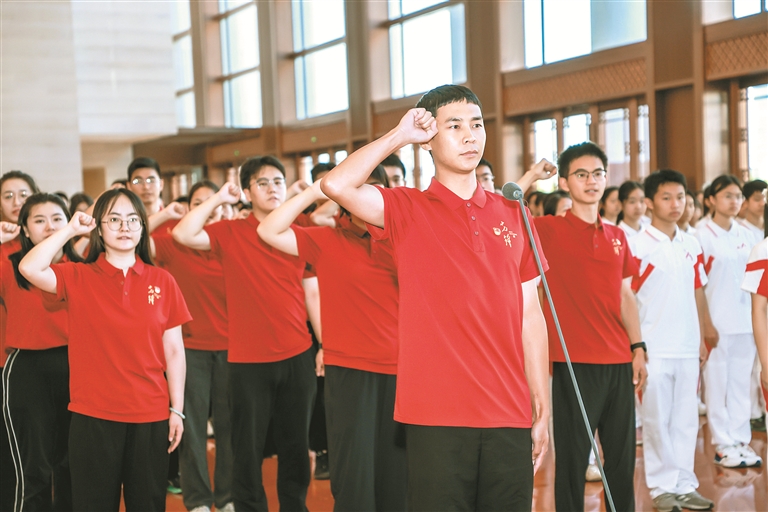 9月8日,“传承和弘扬伟大抗战精神——中国人民大学大中小学生同上一堂思政课”暨北京市学校思政课教师“同备一堂课”活动在中国共产党历史展览馆举行。图为“北京市优秀退役军人”获得者、纪念中国人民抗日战争暨世界反法西斯战争胜利80周年大会青年志愿者代表、中国人民大学国学院硕士生胡金超领誓。中国人民大学供图