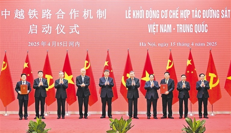 4月15日上午,中共中央总书记、国家主席习近平在河内国际会议中心同越共中央总书记苏林、越南国家主席梁强共同会见中越人民大联欢活动代表。这是活动后,习近平同苏林、范明政共同见证中越铁路合作机制启动仪式。新华社记者 殷博古 摄