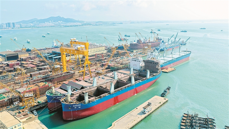 今年以来,山东省荣成市各类船舶的交付数量和手持订单数量屡创新高,呈现出高质量发展的喜人态势。图为近日,该市石岛管理区石岛湾畔造船产业基地的一派繁忙景象。图片来源:视觉中国