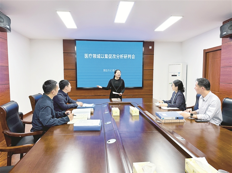 江苏省溧阳市纪委监委用好案例“活教材”,对查处的违纪违法案件开展类案分析,深化以案示警、以案促改。图为溧阳市纪委监委办案人员对医疗领域开展以案促改进行分析研判。许静 摄