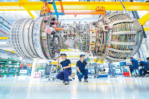 今年上半年,在自贸港政策利好推动下,海南省装备制造业稳步提升,风电装备、航空维修等领域获得多项突破。图为海口空港综合保税区内,某公司的技术团队对一台航空发动机进行“体检”,为下一步维修做准备。 图片来源:视觉中国
