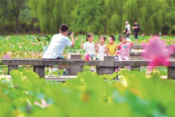 6月23日,浙江省湖州市,长兴县仙山湖景区犹如山水画卷,美不胜收,游客徜徉绿水青山之间,赏荷观景,乐享假日美好时光。 图片来源:视觉中国