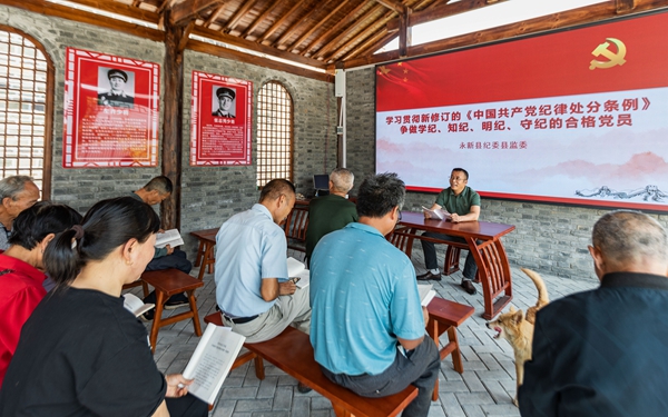 江西省永新县纪委监委坚持分层分类开展警示教育,采取讲授纪律专题党课、观看警示教育片等方式,推动警示教育入脑入心。图为该县纪检监察干部为村(社区)干部讲授新修订的《中国共产党纪律处分条例》。 周亚茂 摄