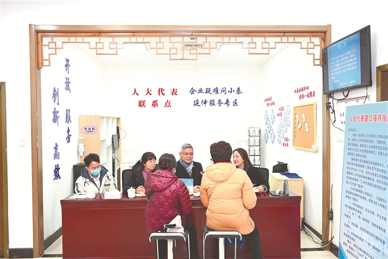 全国两会前夕,江苏省南京市秦淮区政务服务中心内的人大代表联系点,全国人大代表在听取民情。 新华社记者 季春鹏 摄